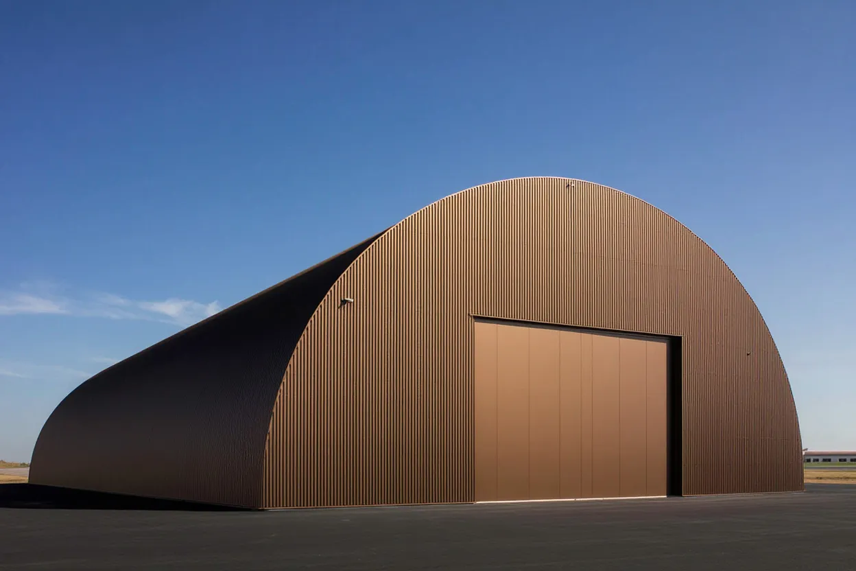 - Конструкция: Каркас ангара выполнен из высокопрочной стали, что обеспечивает его устойчивость к ветровым и снежным нагрузкам. Панели часто изготавливаются с использованием сэндвич-технологий, что повышает теплоизоляционные свойства.